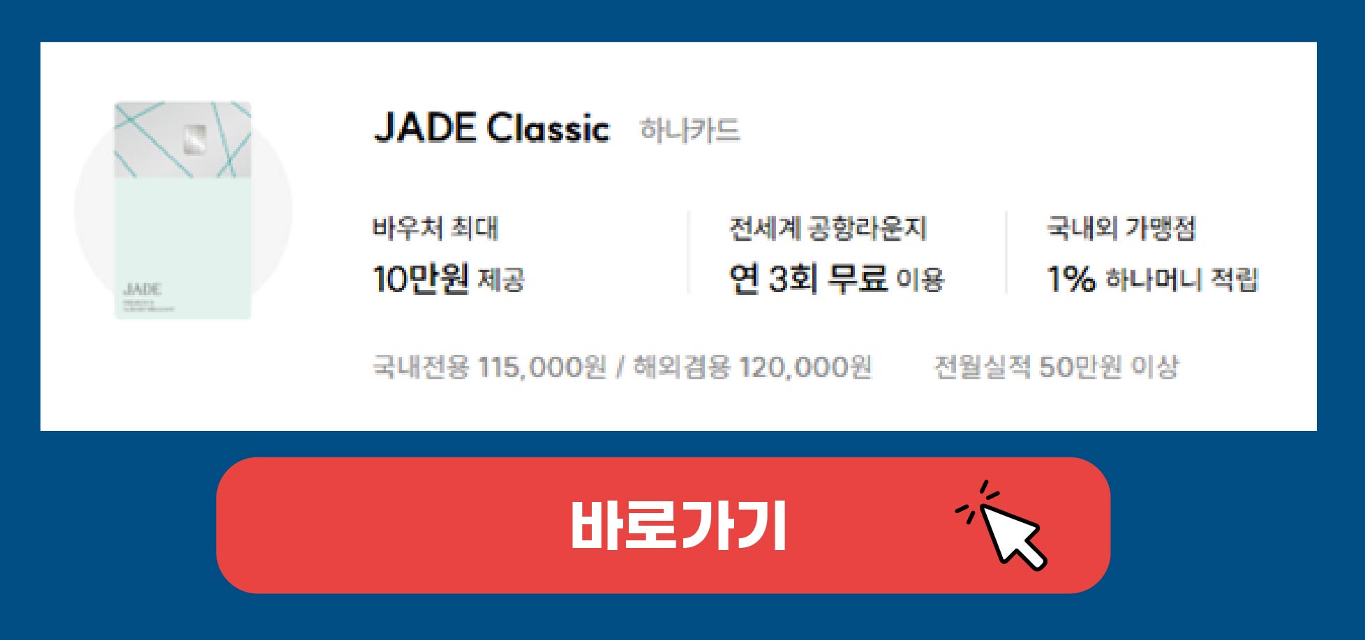 JADE Classic은 발급과 동시에 전 세계 공항 라운지를 본인 포함 동반 2인까지 통합 연 3회, 일 3회 무료로 이용할 수 있습니다. 또한 10만원 상당의 프리미엄 바우처가 제공되므로 활용도가 높지만 연회비가 높아 사용이 부담스러울 수 있으므로 연회비와 프리미엄 바우처를 잘 알아보고 사용하면 효과적일 것입니다.