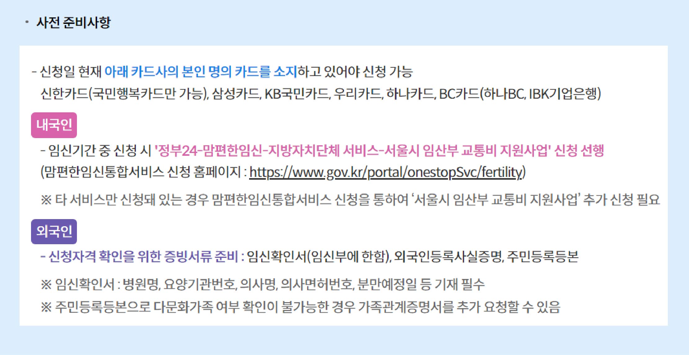 - 준비물: 신분증, 임신확인서, 본인 명의 휴대폰 또는 신용카드/체크가드 (외국인 임산부는 외국인등록사실증명, 주민등록등본 추가 지참)