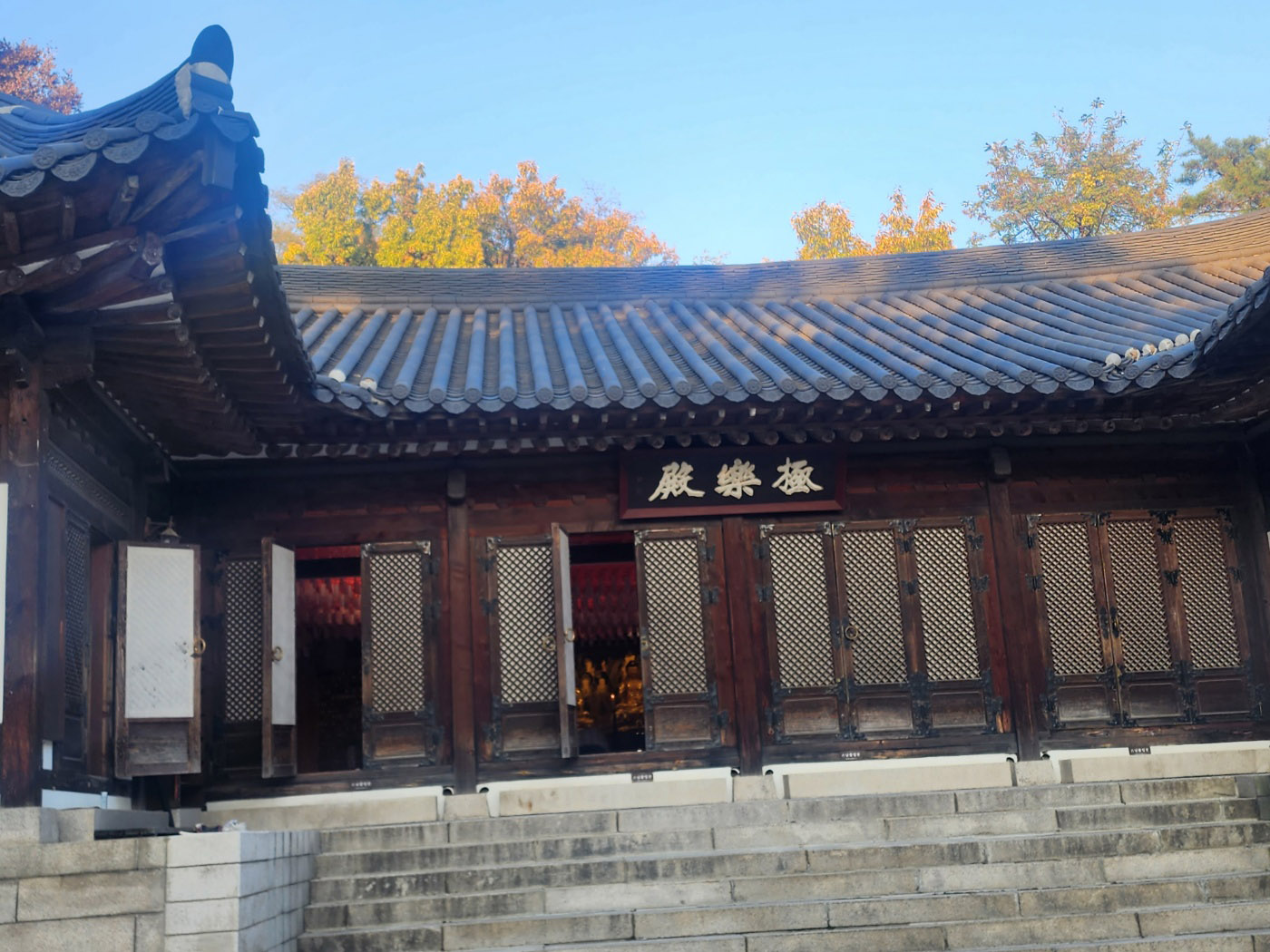 ㄷ자 형태의 극락전 뒤로 가을 단풍과 가을 하늘, 가을 햇살....