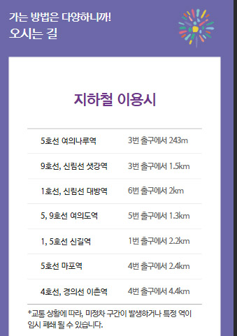 행사 당일에는 인근지역의 도로 상황이 매우 혼잡하고, 63빌딩 앞의 한강공원 주차장은 완전 폐쇄될 예정이므로 자가용 이용시 인근 주차 가능 구역을 확인해야 합니다. 여의도와 가까운 마포구와 영등포 일대의 공영주차장을 이용하는 것이 가장 편리할 것입니다.
